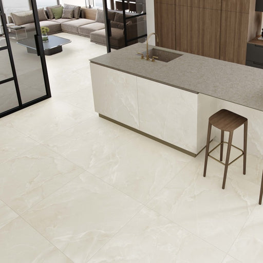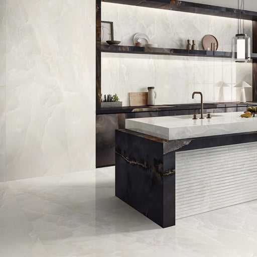 View full detailsThe Scarlet Ivory Onyx 60 x 120 cm rectified porcelain tiles beautifully replicate the luxurious look of onyx marble, offering a serene ivory base ...