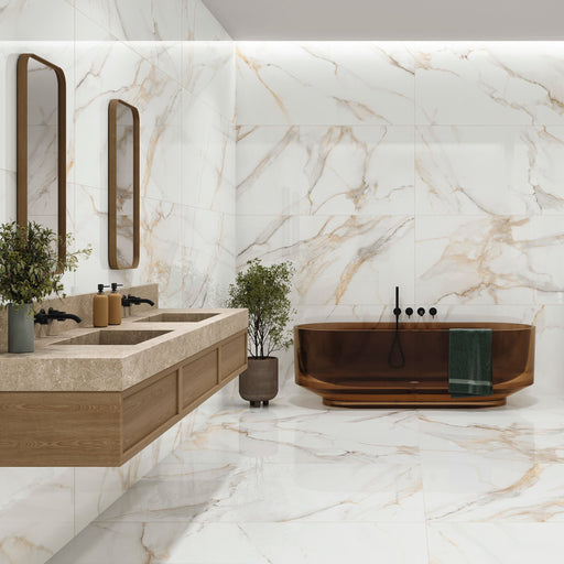 View full detailsThe Lumiere Gold Natural 60 × 120cm polished porcelain tiles offer a luxurious stone-effect design with elegant gold veining, creating a striking a...